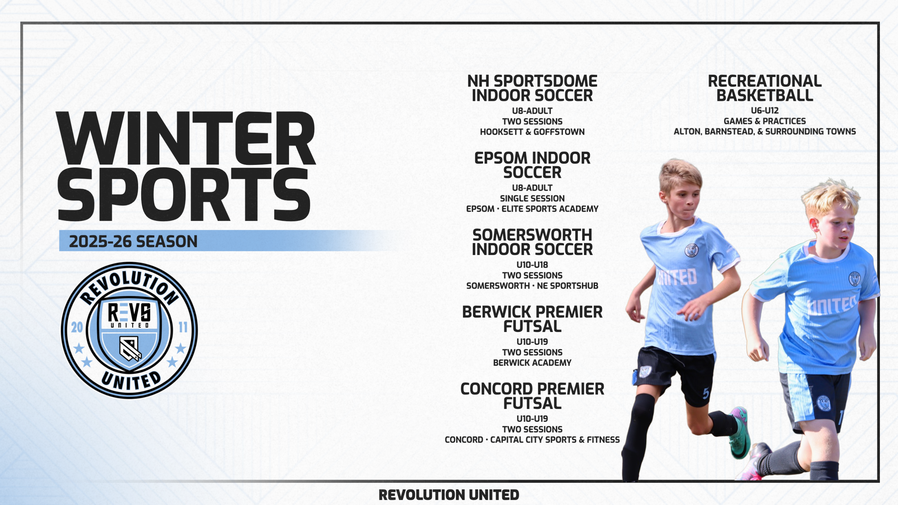 Registrations for the Winter 2025-26 season will be closing soon. Register your player today so you don't miss out! Take a look at all of the options that we are offering below, and click to learn more or to register. We have options for boys & girls, ages U6 all the way to adults.